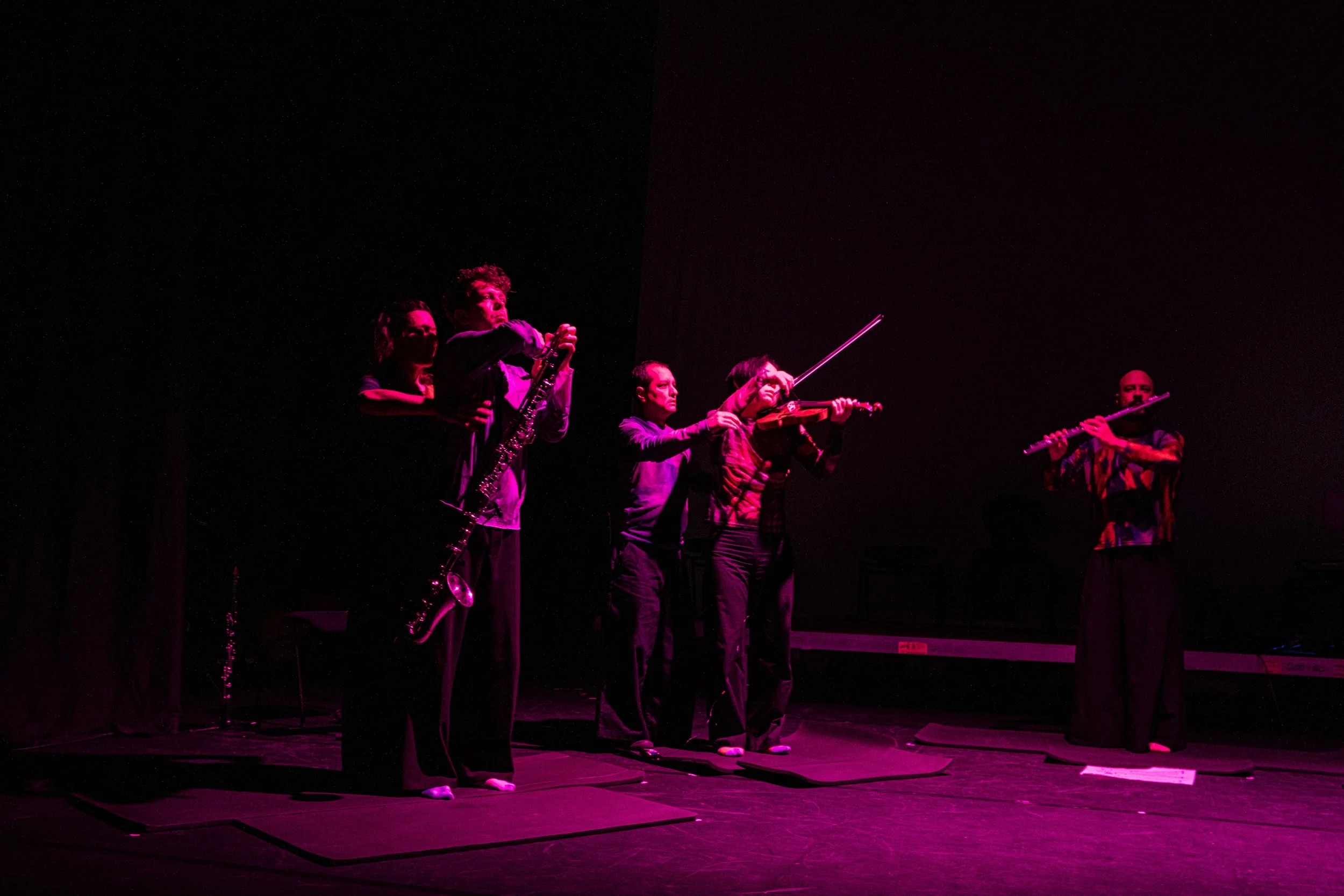 flute, clarinet, violin, cello, electric guitar and choreographed gestures